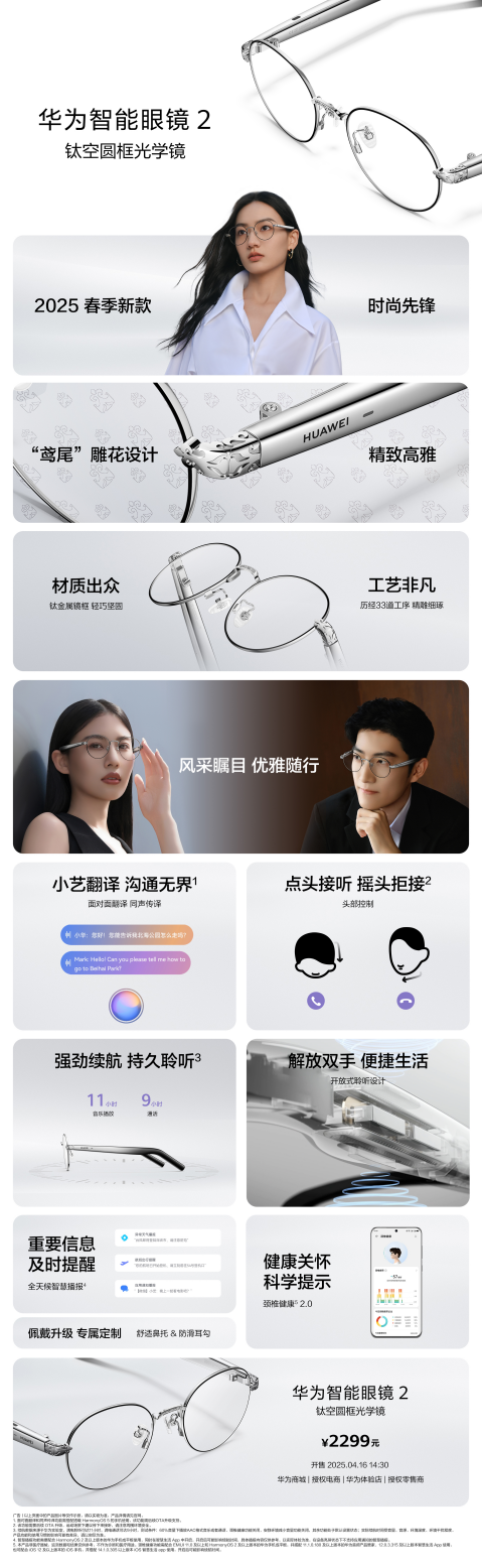 华为智能眼镜 2 钛空圆框光学镜定价2299元,于4月16日全渠道正式开售。 4月16日至4月22日,可享200元优惠、最高可享六期免息分期。同时华为商城还提供专业线上配镜服务,欢迎大家选购。