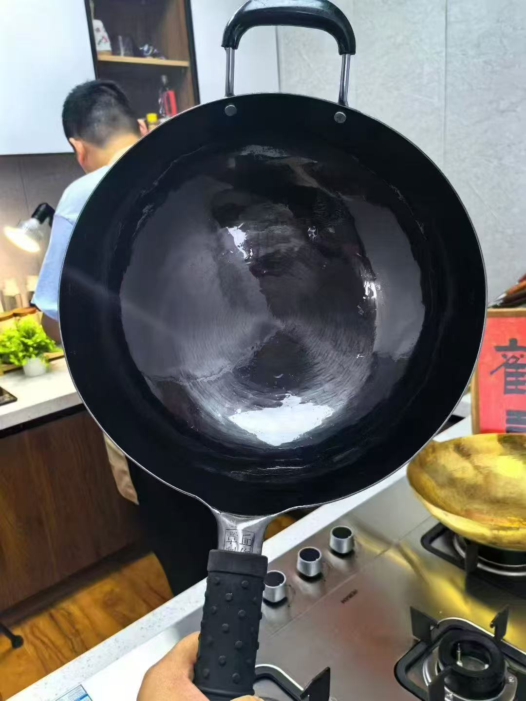 用它做饭超省心:无化学涂层,靠自然形成的油膜实现物理不粘,煎鱼、炒排骨不粘底;烹饪中还能微量补铁,守护老人孩子健康。3.5mm 加厚锅底让受热均匀,炒青菜脆嫩不夹生,炖鸡汤整锅入味。更贴心的是,它比普通铁锅轻 15%,女生单手就能颠锅,钢丝球清洁、明火干烧都不怕设计满是巧思:一体成型锅身无清洁死角,胡桃木手柄防烫好握,加深锅型防溅油,适配多种炉具。