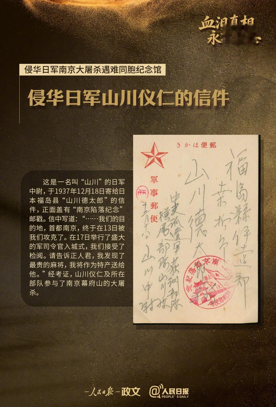 侵华日军的暴行照片集、盖有 “南京陷落纪念” 邮戳的信件、报道 “百人斩” 竞赛的报纸......每一件文物,都是固定历史真相的铆钉。今天,第十二个国家公祭日,昭昭前事,惕惕后人。不能忘!不敢忘!