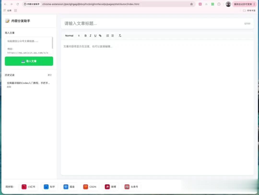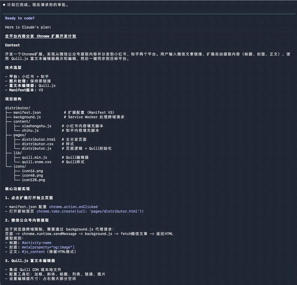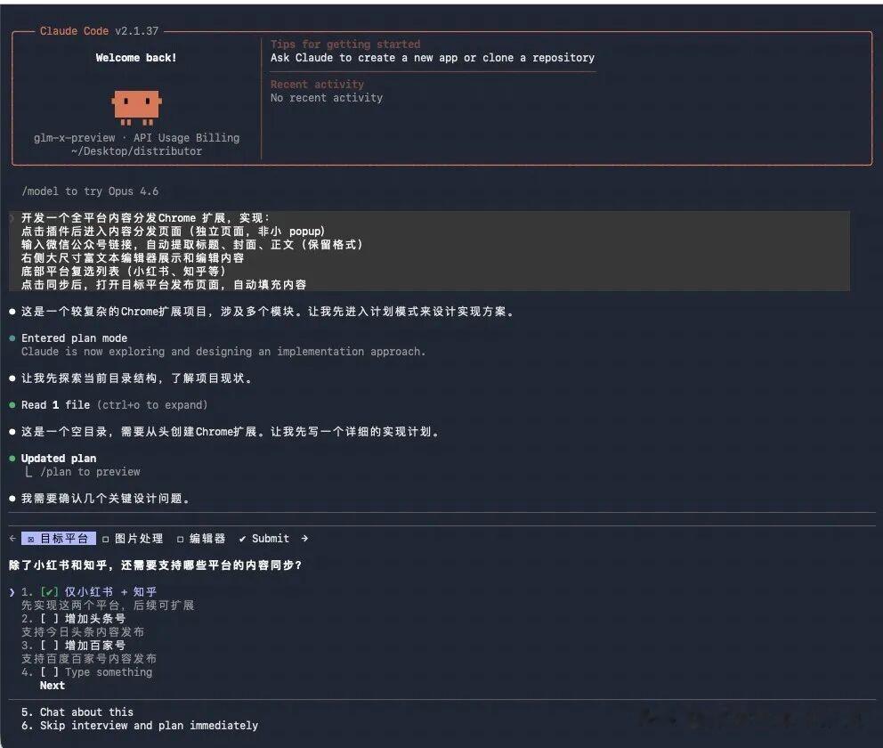 开发一个全平台内容分发Chrome 扩展,实现: 点击插件后进入内容分发页面(独立页面,非小 popup) 输入微信公众号链接,自动提取标题、封面、正文(保留格式) 右侧大尺寸富文本编辑器展示和编辑内容 底部平台复选列表(小红书、知乎等) 点击同步后,打开目标平台发布页面,自动填充内容当时给过去以后,GLM-5的体感上,其实就比之前GLM-4.7强很多了。