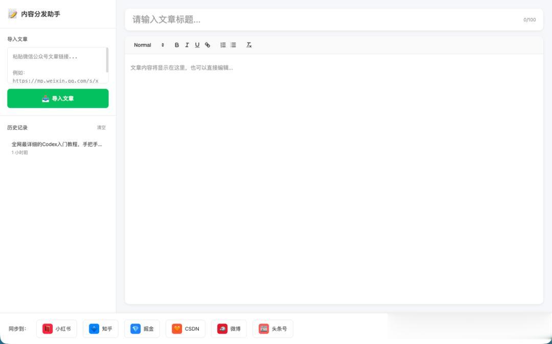 就是下面图中的这样,大概的功能就是把我微信公众号的文章链接放进去,然后点击想要同步的平台,就可以同步过去。