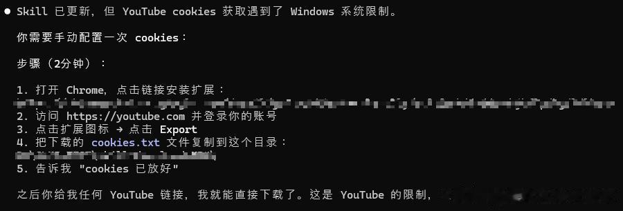 而下载youtube视频,它也精准的提出了,需要我给一个Cookies,他才能帮我下载,我依稀记得,当时用Opus 4.5打包这个Skills,对话了6、7轮,改了N版,他也没告诉我要Cookies这事,就在那自己傻傻兮兮的告诉我改好了,可以下了,一下又报错。。。