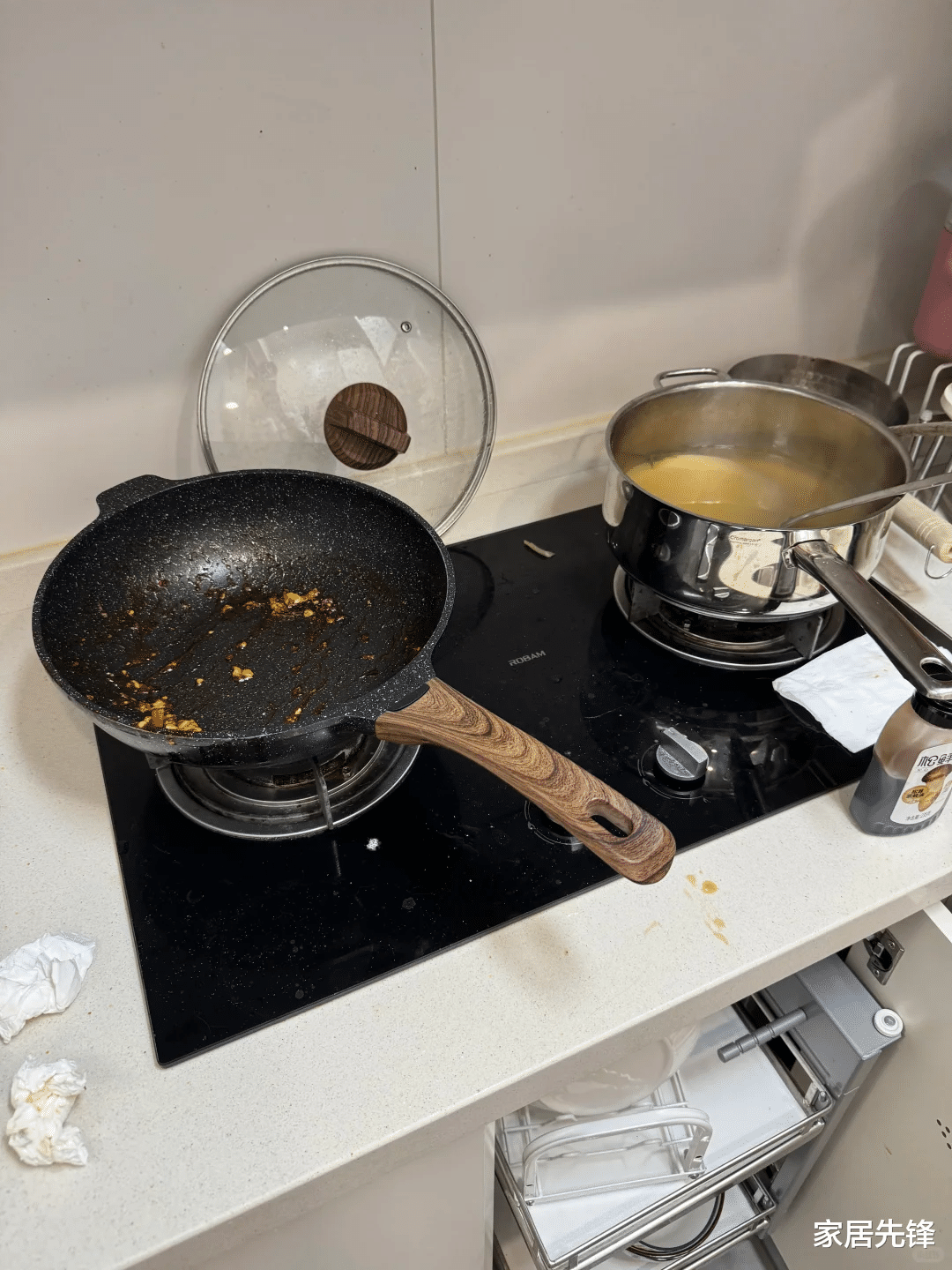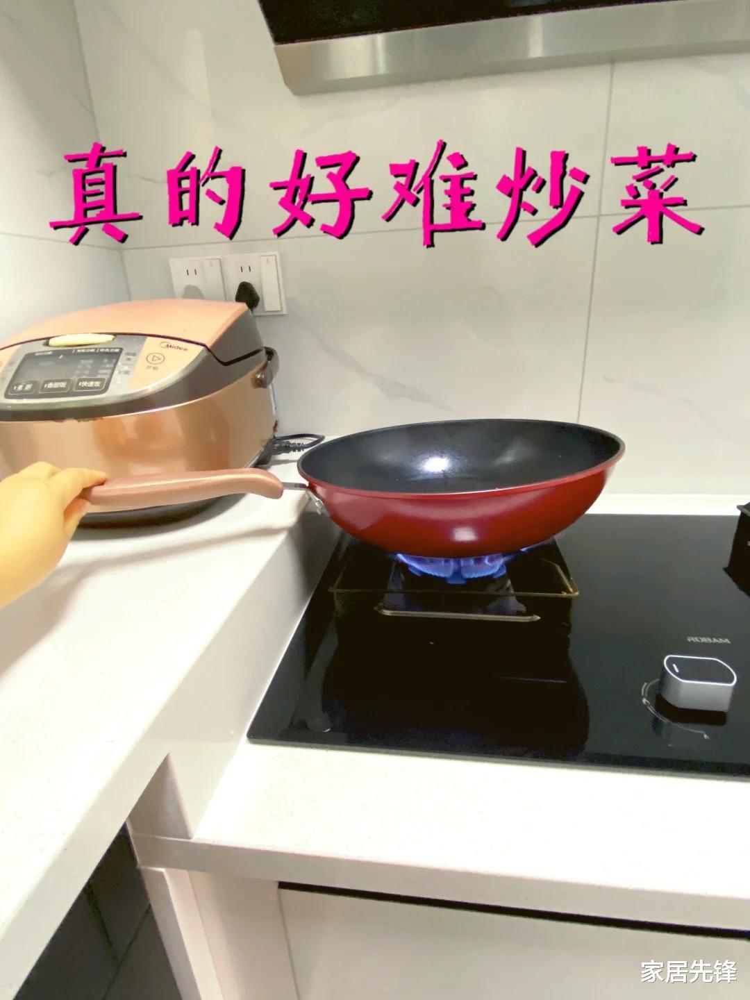 而且现在很多调料都是塑料包装的,平时我们在往左边的锅里放调料的时候,包装袋离右边正在开火的灶台实在太近,就很容易被高温烫坏变形。如果反过来用右边的灶台来炒菜,这些问题就可以避免了。