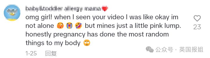 “天呐!看到你的视频时,我当时心里就在想,‘太好了,原来不止一个人这样啊’不过我的副乳就只是一个小小的粉色肿块。说实话,怀孕真的给我的身体带来了好多莫名其妙的变化。”