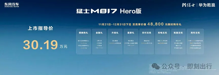 11月21日,2025广州国际车展正式拉开帷幕,新能源与智能化浪潮下,豪华越野赛道成为品牌角逐的新焦点。本届车展上,猛士汽车与华为乾崑联手打造的豪华智能越野SUV——猛士M817家族新成员M817 Hero版震撼上市,官方指导价30.19万元,搭配12月31日前下定可享的价值48,800元限时购车权益及四大基础无忧权益,为越野爱好者带来“野得安心、改得尽兴”的硬核之选,重新定义30万级智能越野SUV的价值天花板。