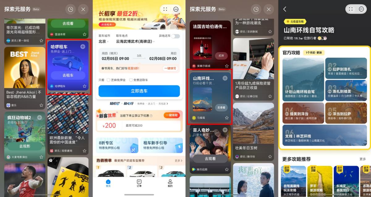 春节自驾返乡或周边游,哈啰租车、马蜂窝、捷停车等实用卡片会提前出现在负一屏。点一下就能快速预订车辆,还能查看热门自驾路线攻略;路上需要加油时,附近的加油优惠卡片适时弹出,免下车享优惠;抵达目的地后,“捷停车”自动匹配附近停车点,离场时车牌识别自动扣费,全程无需额外操作。在你需要“赶路”的时候,探索元服务替你省下“操心”。