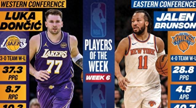 这周的最佳球员也出来了,东部是尼克斯的布伦森,西部就是湖人的东契奇。布伦森带着尼克斯一波4连胜,自己也拿了8次周最佳了,挺厉害。但风头全被东契奇抢了,这家伙带着湖人3场全胜,场均数据都快到37分三双了,拿个周最佳简直是板上钉钉。