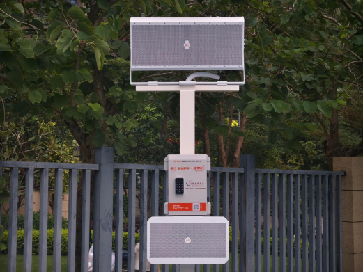 3)定音量:将声音聚集在设备正前方发声,活动声源处音量不超过85分贝,距声源最近的噪声敏感建筑一米处的音量不超过55分贝,从源头防控噪声。