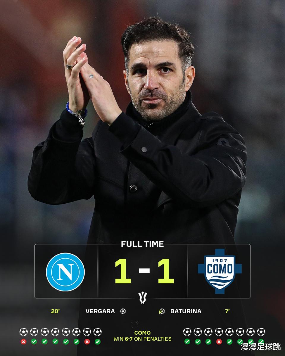 意大利杯1/4决赛,90分钟1-1,点球大战鏖战到第8轮,最终科莫以总比分8-7掀翻那不勒斯。卫冕冠军倒下,法布雷加斯带队杀入四强,他们的对手正是强大的国际米兰!