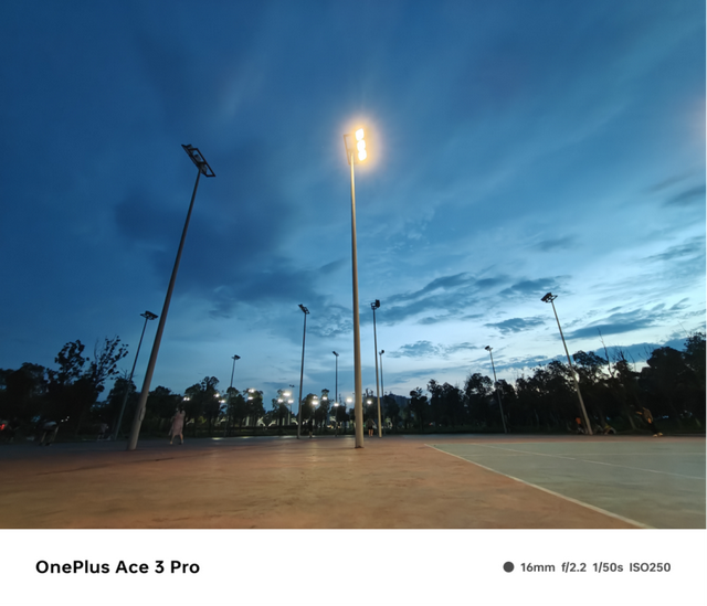 逆光:此外因为算法的加持,我对广角的高光压制还是很满意的。这是在羽毛球场拍摄的照片,在预览的时候那个路灯是过爆的状态,三盏灯已经连成了一条线但是成片中三盏灯分的还是很清楚的。