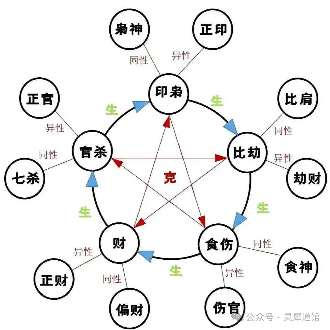 依据日干与其它字的生克关系,把五行分成十神,分别是:正印、偏印,正官、偏官,正财、偏财,食神、伤官,比肩、劫财。