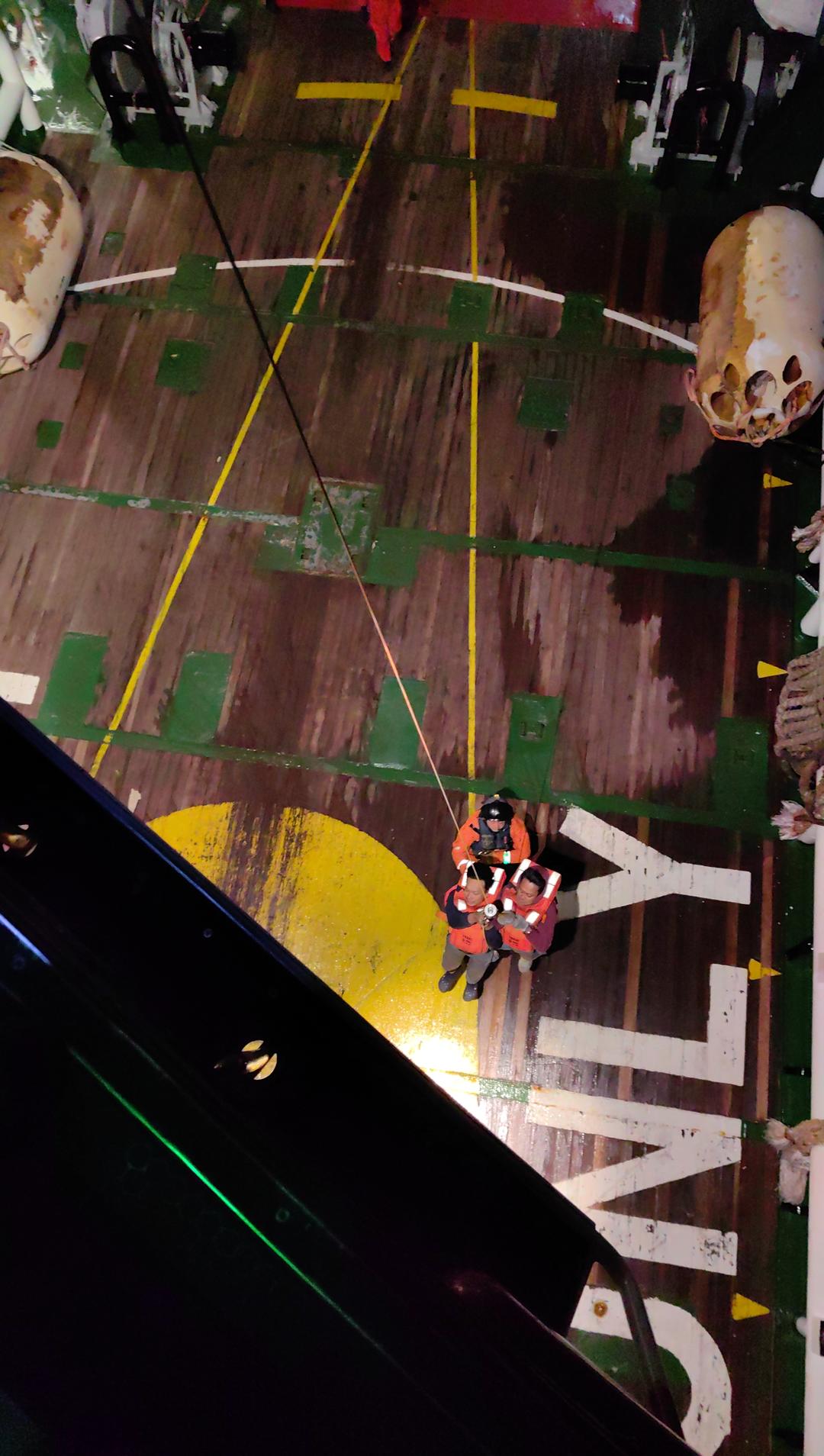 23时10分,“B-7125”机组采用绞车吊运方式将直升机上13名状态良好的船员转移至“北海救119”轮,由救助船员对其进行妥善安置。