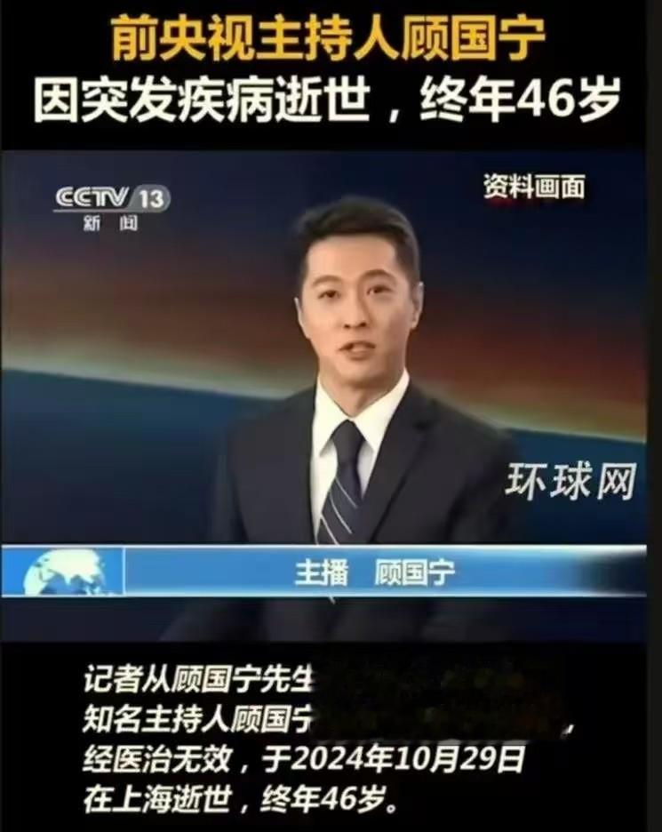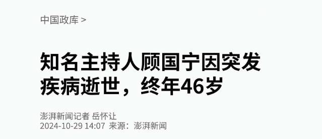 澎湃新闻《知名主持人顾国宁因突发疾病逝世,终年46岁》