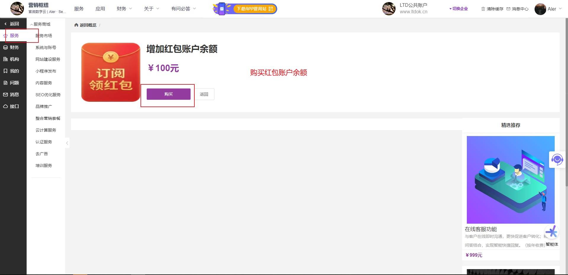 点击「充值更多金额」跳转至服务市场的「增加红包账户余额」购买页,选择充值金额(如 100 元),点击「购买」完成支付。