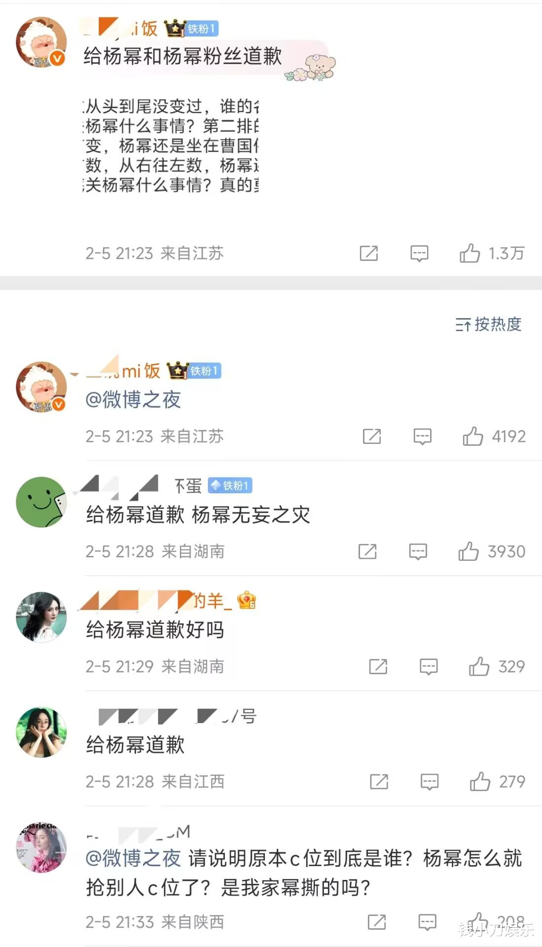 这个回应下面,全是杨幂粉丝在要求主办方给杨幂道歉,粉丝认为杨幂的座位从头到尾都没有变过,不能把肖战座位的变动强行扣到杨幂头上。