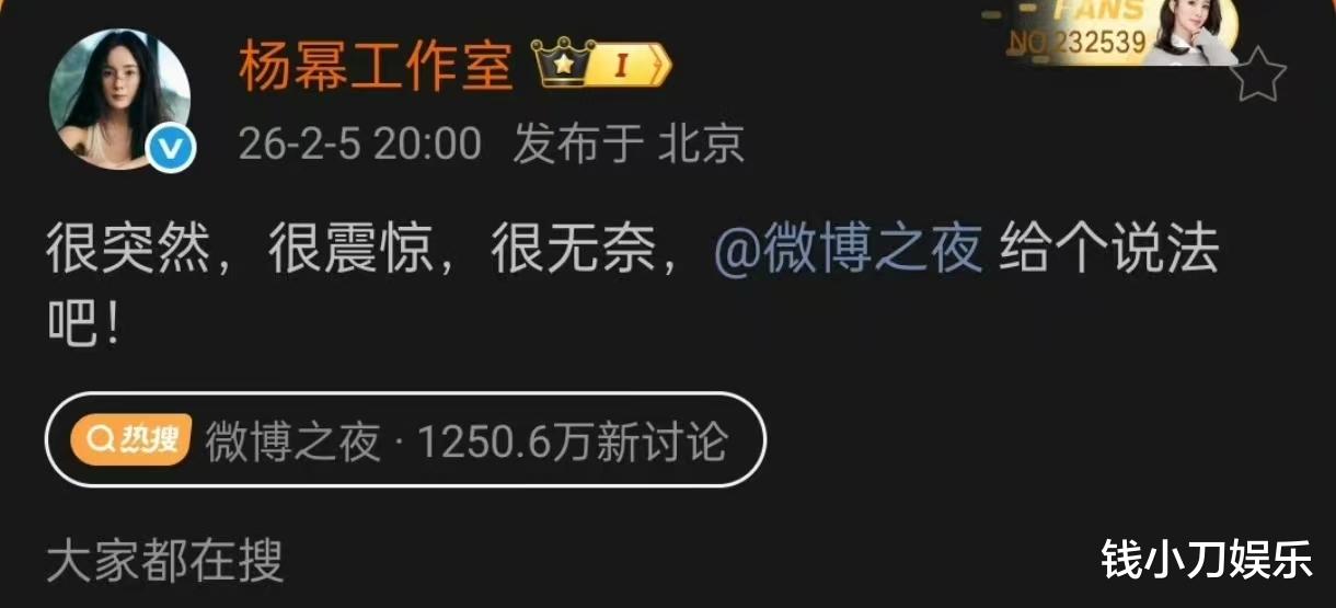 对于网上的质疑,杨幂工作室反省迅速,用9个字霸气开撕,直接艾特了微博之夜官博,让主办方给说法。