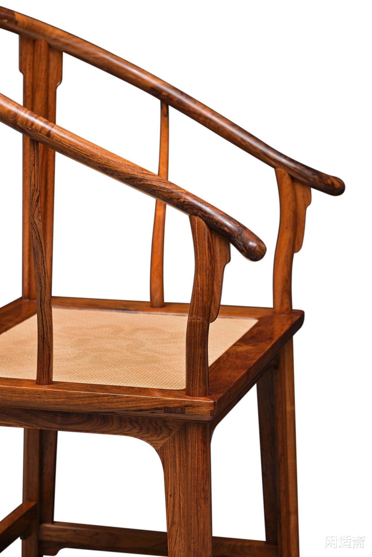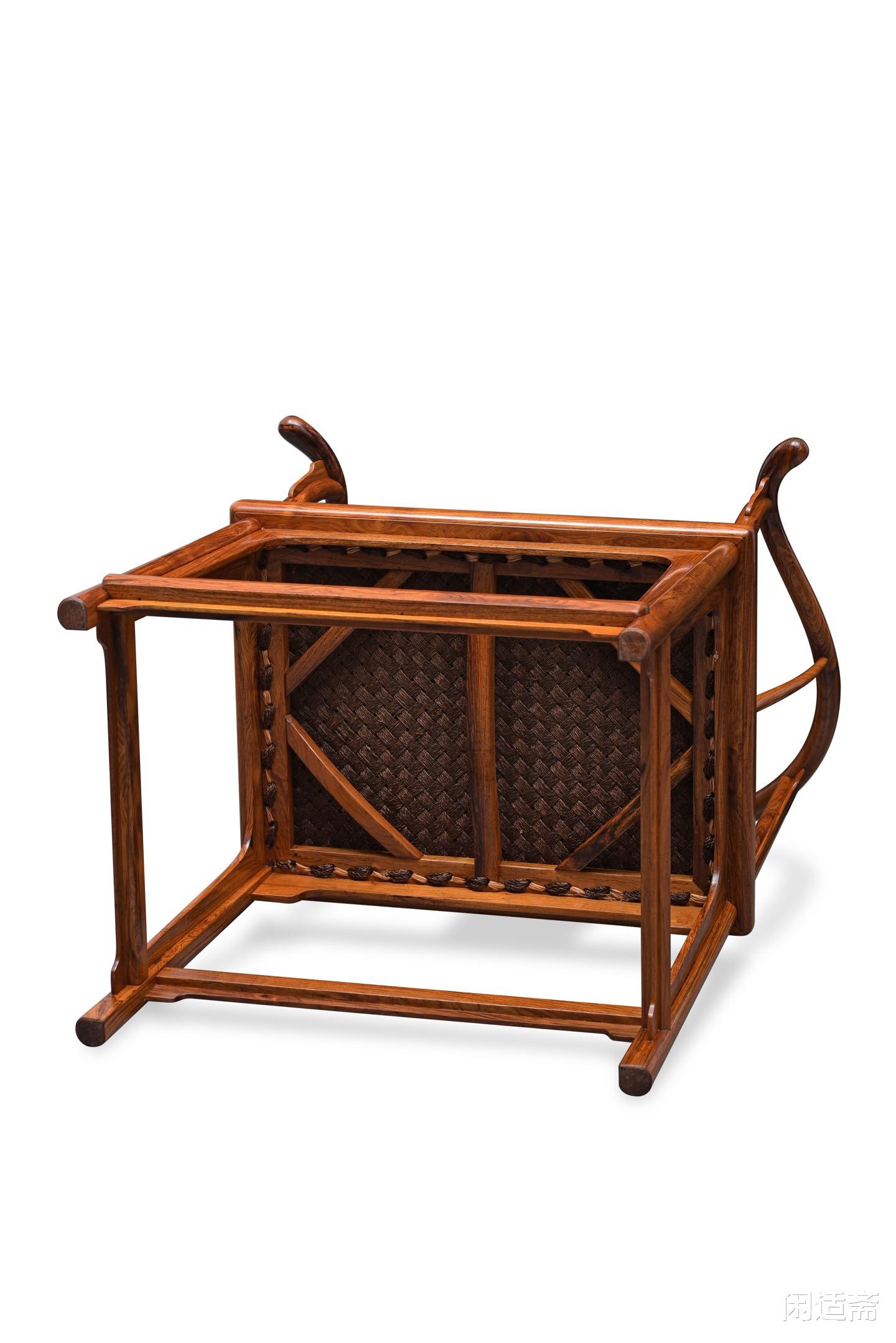 椅体结构稳固精巧,四腿采用“外圆内方”形制,上下一木连做,既彰显“天圆地方”的哲学意蕴,又保障了椅体的承重性能与耐用度,全靠榫卯衔接严丝合缝,尽显明式榫卯工艺的博大精深。