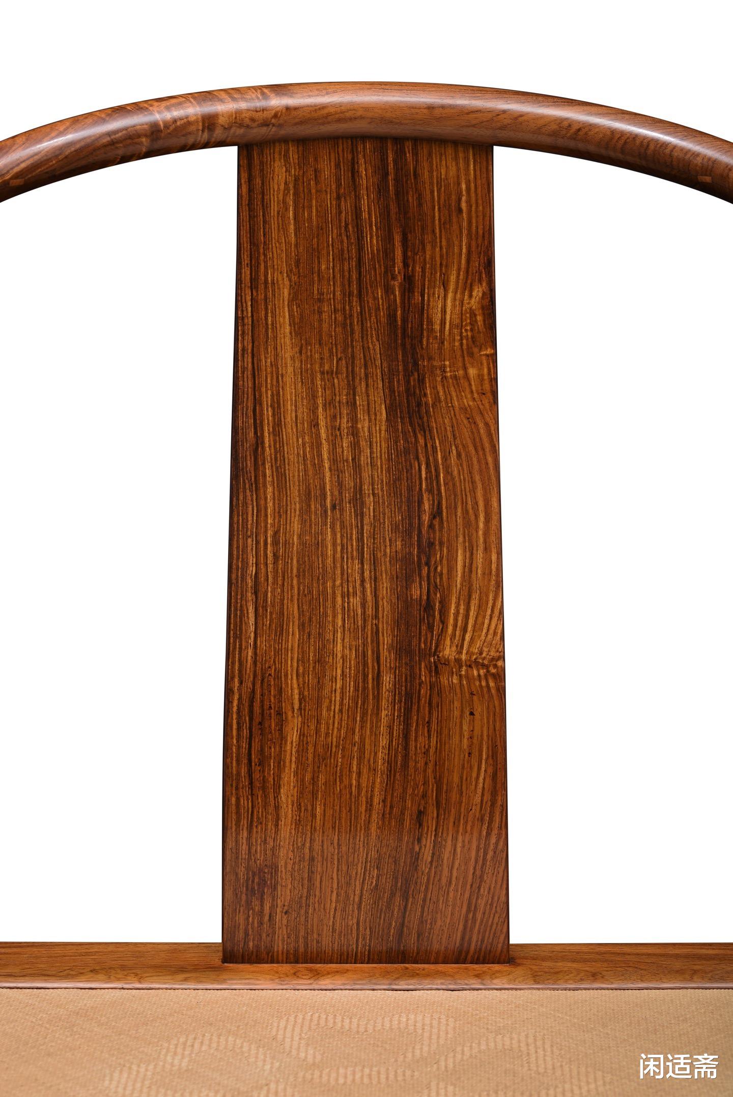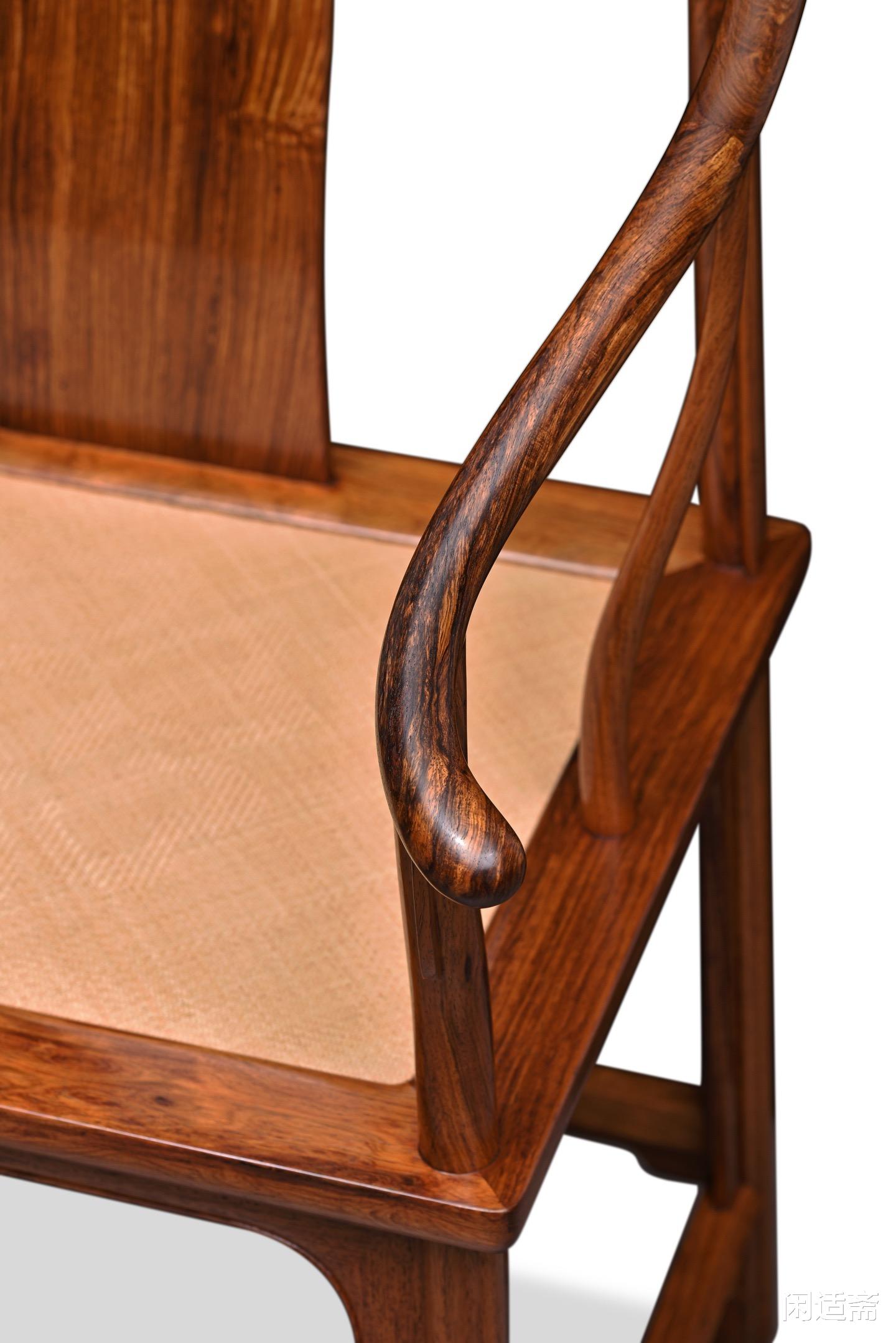 扶手采用经典三接工艺,弧线饱满流畅、过渡无痕,自上而下顺势倾泻,至末端向外微扩,环抱感十足,贴合人体手臂弧度,倚靠时自然承托,舒适妥帖。椅背为独板光素设计,无多余雕饰,线条简洁利落,弧度精准贴合人体脊背,兼顾美观与坐感,尽显明式家具“重质轻饰”的审美精髓。