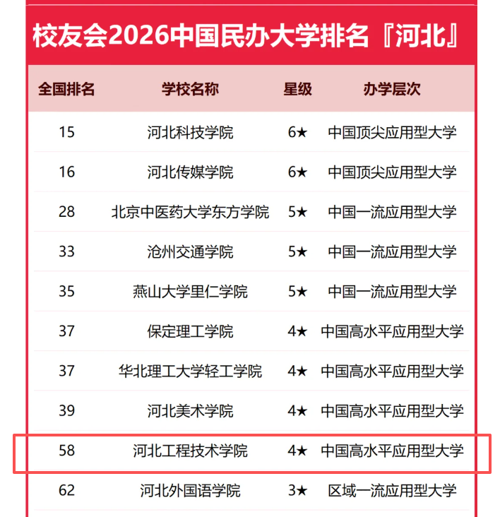 谈到大学,大家的第一反应往往是去看各种五花八门的榜单,而河工院在 2026 年的排名表现,足以让每一个关注它的人感到一种“物超所值”的惊喜。在校友会发布的中国民办大学排行榜中,常年稳居前列,不仅在省内是公认的排头兵,在全国范围内也展现出了极其强劲的上升势头,仅2026年就位居全国第58名,省内第九。这种排名背后的逻辑,其实是一种极其务实的“降维打击”:它不盲目追求综合性大学那种大而全的虚名,而是把所有的资源和精力都精准地倾注在“技术”这个关键词上。
