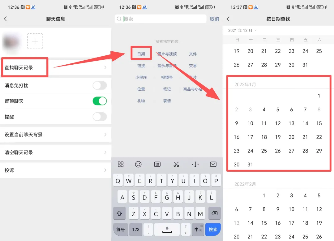 5、点击「日期」,就可以看到和好友聊天的所有日期,日期显示黑色的代表当天有聊天记录,显示灰色的代表没有聊天记录