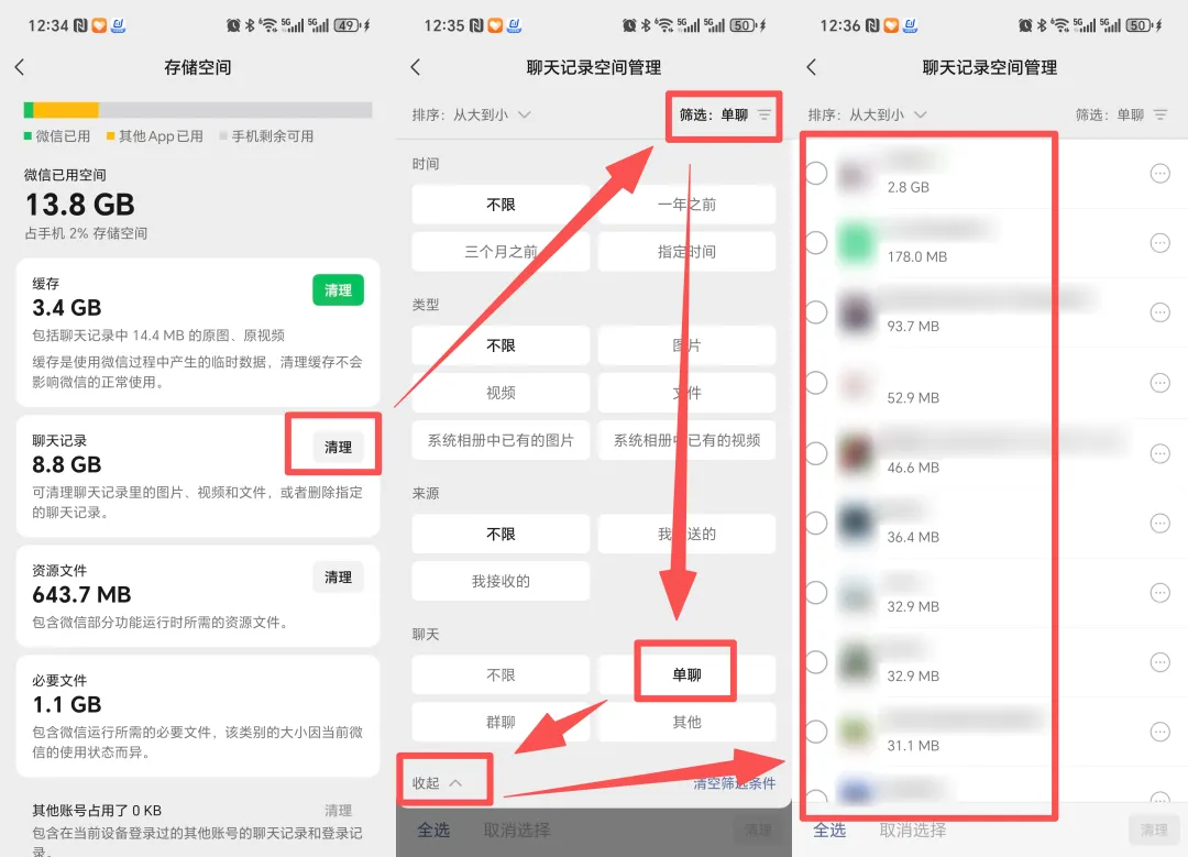 这个功能的原理非常的简单,微信聊天时,会往手机存储聊天数据,聊天内容越多,那么存储空间占用就越大。