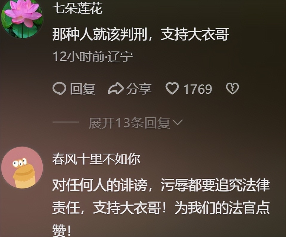 而网友们也是一边倒地力挺大衣哥, 留言称那些造谣的人就应该被判刑,对于任何人的诽谤造谣都要追究法律责任,支持大衣哥维权。还有网友赞叹大衣哥赚钱后为社会做了很多好事,做公益,捐款之类的。