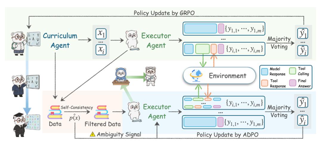 Agent0 的核心是一个双智能体协同进化系统。系统包含两个从同一基础模型初始化的 Agent:课程智能体(Curriculum Agent)负责生成问题,执行智能体(Executor Agent)则尝试解决这些问题。