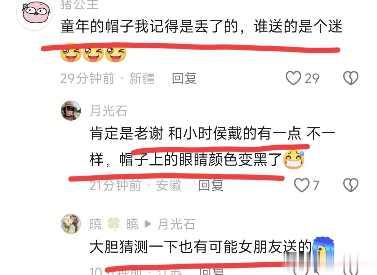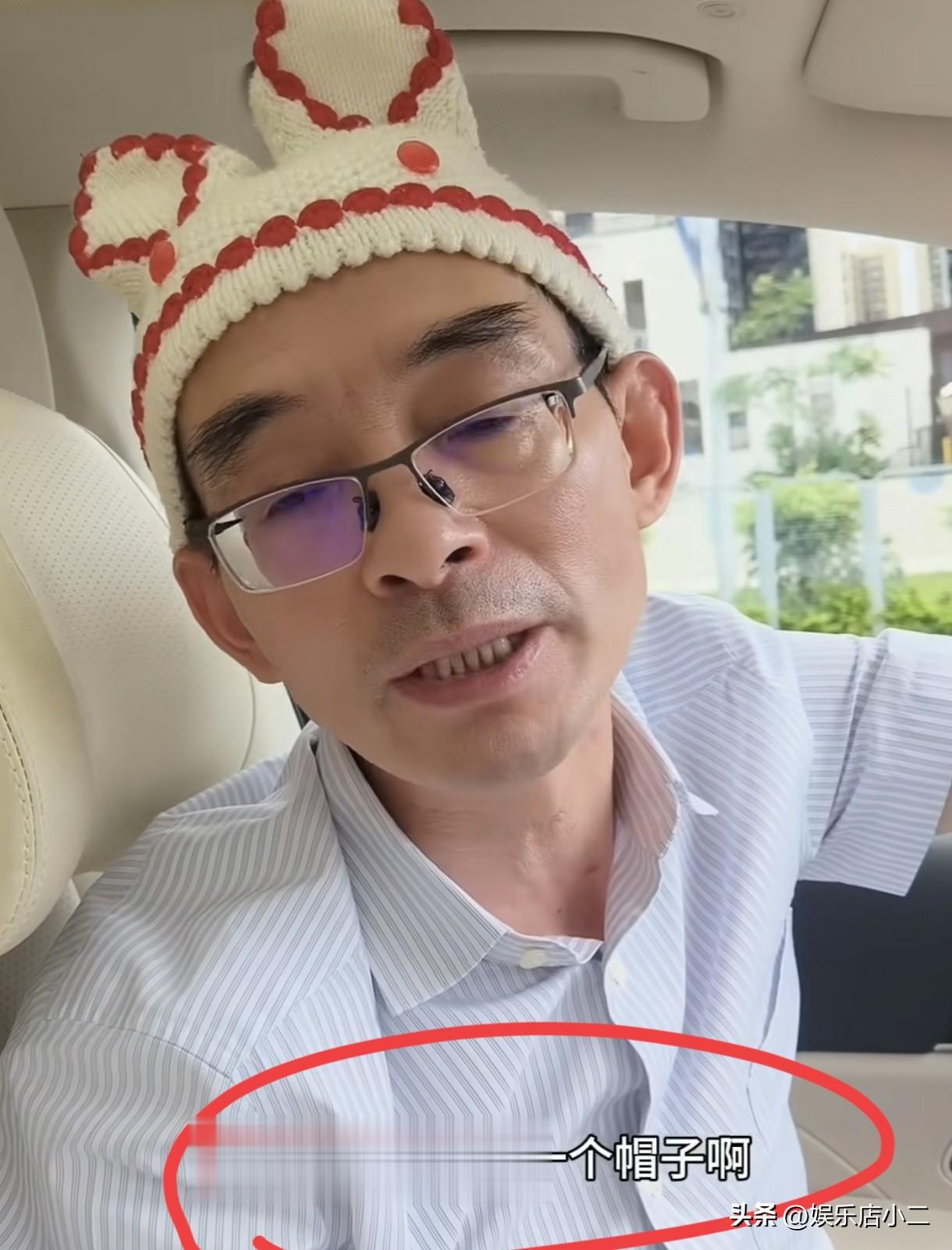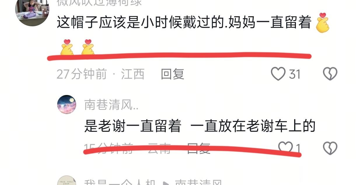 关于这个帽子,还有一个动人的故事。那是在2024年6月份的时候,老谢一个人坐在车里戴着同款的帽子。