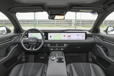 动力够强、油耗够省,底盘和操控也得跟上,不然就成了“光有马力没质感”。福特在底盘调校上的功底一直很扎实,这一点在蒙迪欧E-混动上得到了很好的延续。它采用前麦弗逊+后多连杆独立悬架结构,悬挂的硬度和行程调校得很有韧劲,既不是一味追求舒适的软塌塌,也不是偏运动的硬邦邦。平时开着过弯时,车身侧倾控制得很好,方向盘指向精准,没有虚位,开起来感觉车身很紧致,比老款蒙迪欧的操控感更突出,那种“指哪打哪”的精准度,能给驾驶者足够的信心。遇到路面坑洼或者减速带时,悬挂又能很好地过滤颠簸,不会有生硬的冲击感,传到车内的震动很柔和。有一次全家出游跑高速,遇到连续弯道和超车变道,车身稳定性特别好,悬挂既能传递清晰的路感,又能牢牢稳住车身,家里老人和孩子坐在后排也没有晕车,这一点比我之前试驾过的某日系B级车表现更出色——那款车虽然舒适,但过弯时侧倾明显,长时间乘坐容易让人头晕。方向盘的手感略偏沉稳,低速行驶时不会觉得沉重,高速时又能带来扎实的驾驶感受,这种调校很符合家用兼顾驾驶乐趣的需求。