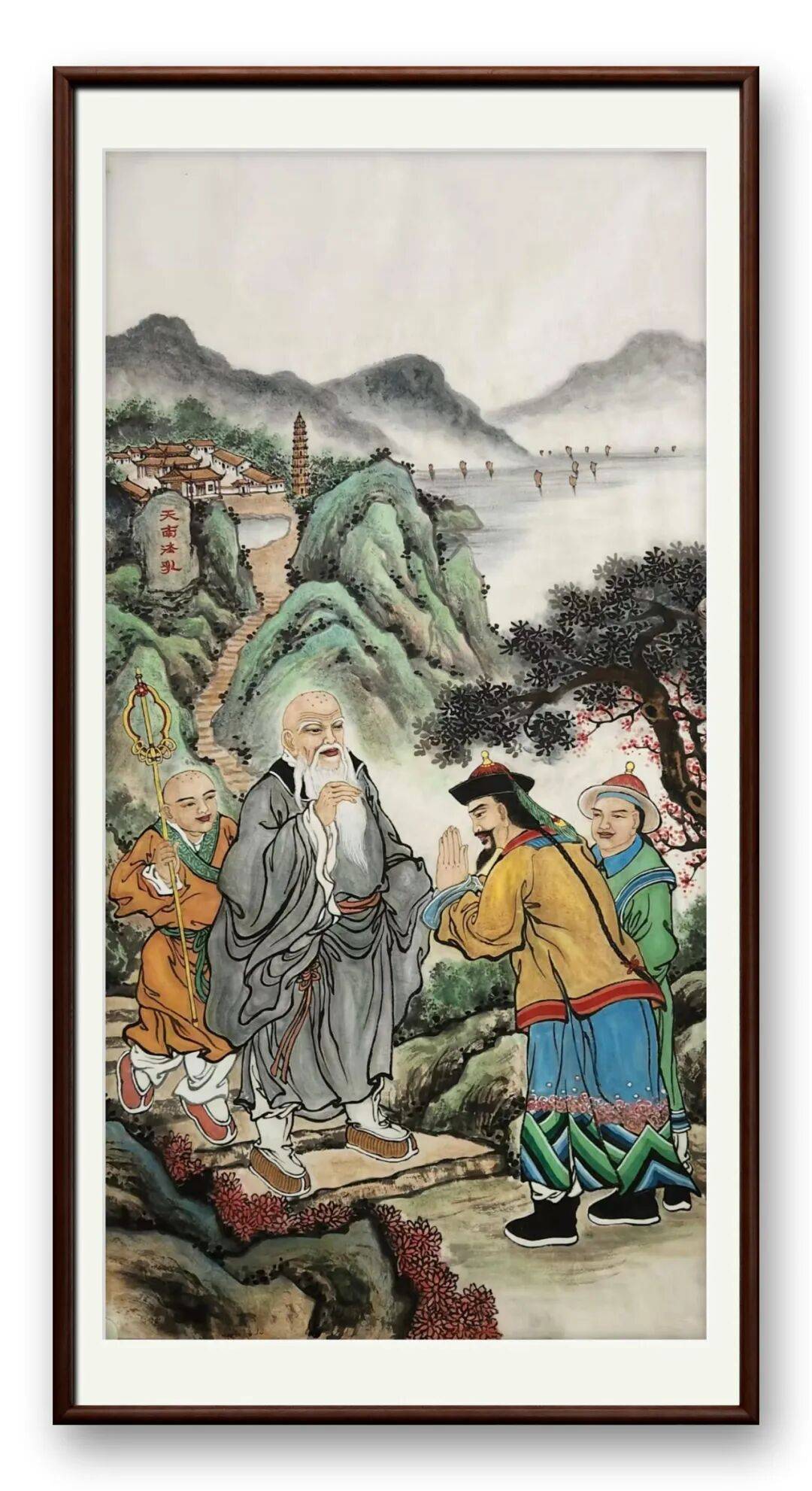 元和十五年秋,韩愈奉诏离潮赴袁州,专程赴灵山寺向大颠祖师辞行。松风阵阵,红叶如丹,刺史青衫微拂,亲手解下官袍,郑重递与高僧。大颠合十含笑,眼中尽是惜别之意,身旁沙弥执杖侍立,见证这儒释相契的一刻。