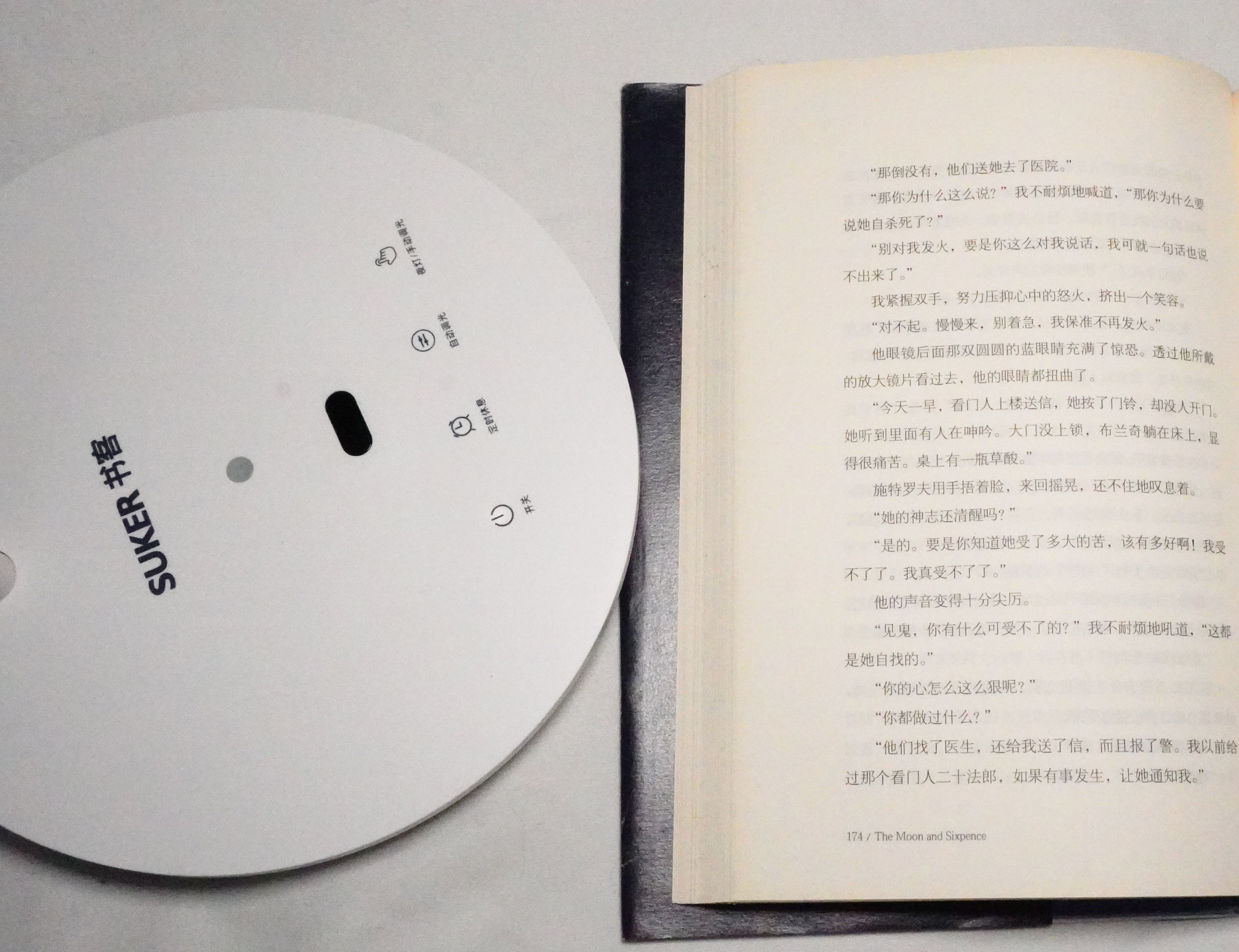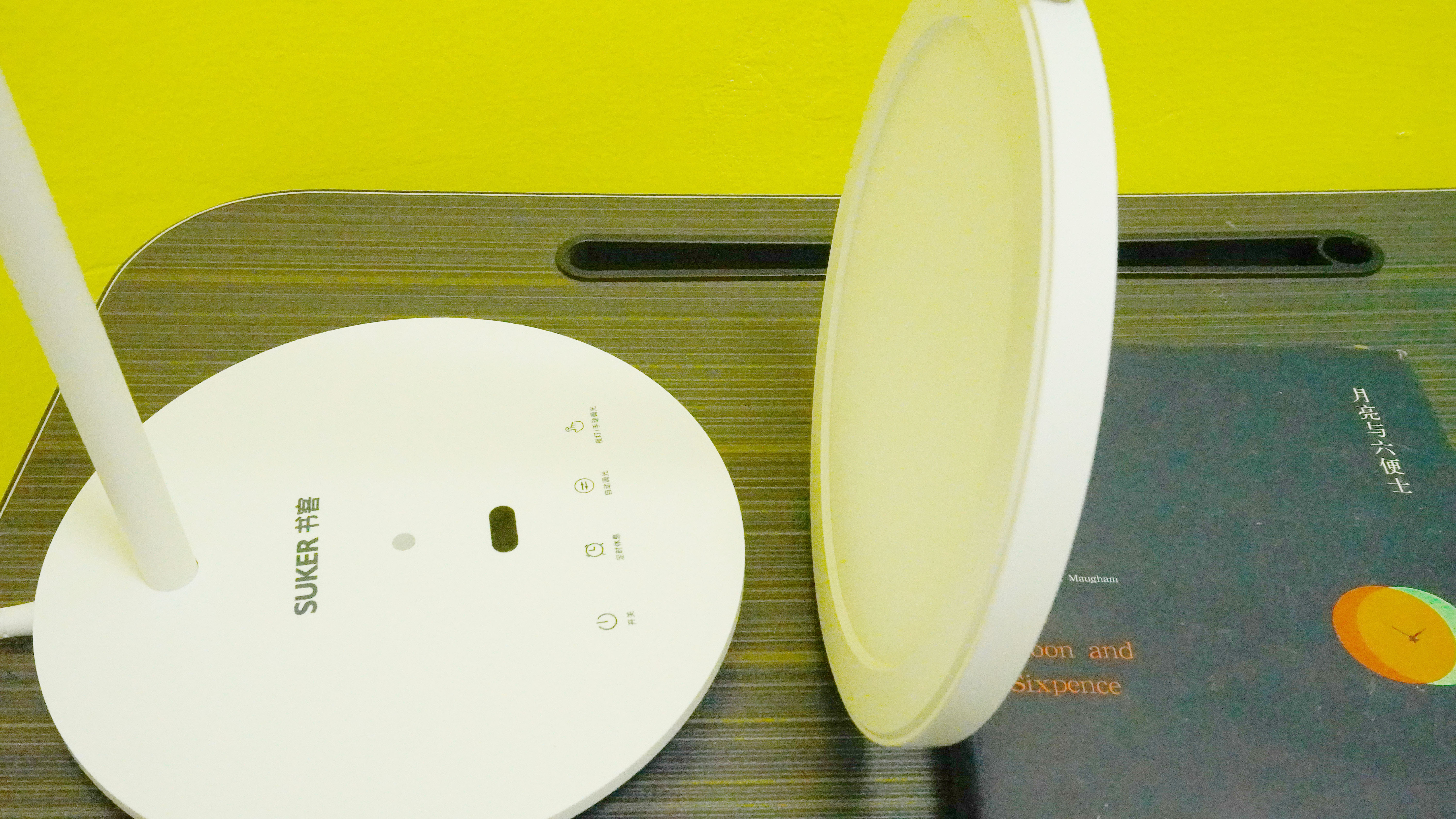 书客L1采用了全触控顺滑面板,上部为醒目的SUKER书客LOGO,黑色椭圆形为手势识别位置,下方为四个触控按键,分别为开关、定时休息、自动调光、夜灯/手动调光。实际操作非常简单,隔空+触控,相比实体按键,便捷了不少。
