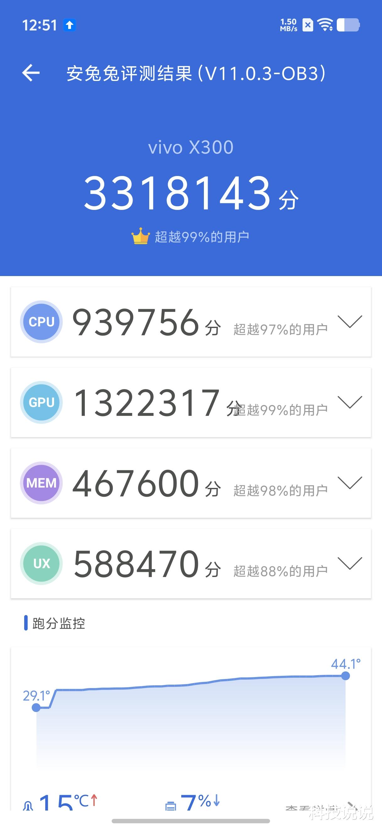 vivo X300搭载了最新天玑9500芯片,基于台积电第三代3nm制程打造,搭载vivo、MediaTek、Arm三方共同打造的全大核3.0 Super CPU架构,主频最高可达4.21GHz。基于强大的硬件基础,其在安兔兔综合性能测试中,跑分轻松达到330万分。