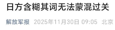 近日,日本个别政客在台湾问题上发表错误言论,公然挑战一个中国原则,引发中日外交风波。面对中方的严正交涉,日方虽口头上表示“立场未变”,却对收回错误言论只字不提,试图以含糊其辞蒙混过关。对此,“解放军报”11月30日刊文,一针见血地指出:日方此举行不通!