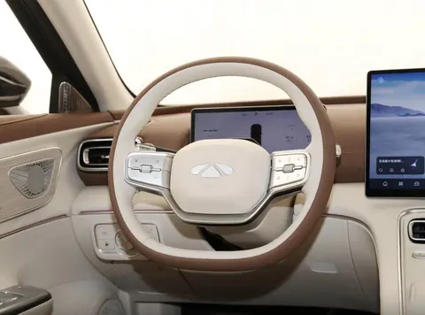 内饰座舱核心是创新的5纵3横一体化智能座舱布局:以 15.6 英寸 2K 悬浮中控屏为中心,搭配 12.3 英寸全液晶仪表与 AR-HUD 形成 “三横” 视觉主线,5 条贯穿式饰条从门板延伸至中控台,构建环抱式空间。四座版通过行政智控中岛划分独立后排区域,座椅采用婴儿级生态材料与双绗缝工艺,配备 8 点按摩、加热 / 通风及零重力模式,中岛内置 - 18℃至 55℃冷暖箱,商务属性拉满。