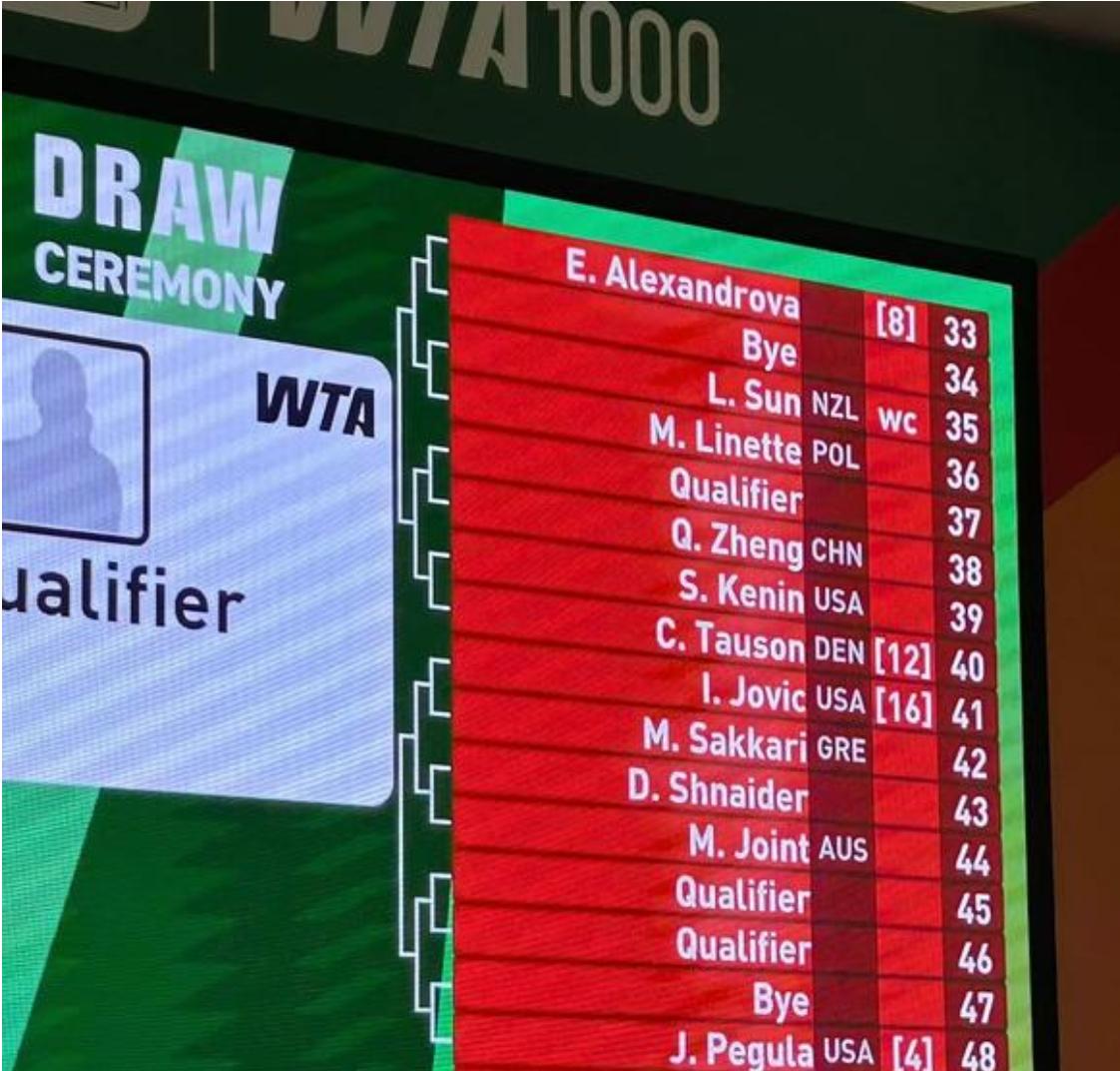 中国金花郑钦文被分到了佩古拉和亚历山德罗娃所在的四分之三区,首轮对阵一名资格赛球员。
