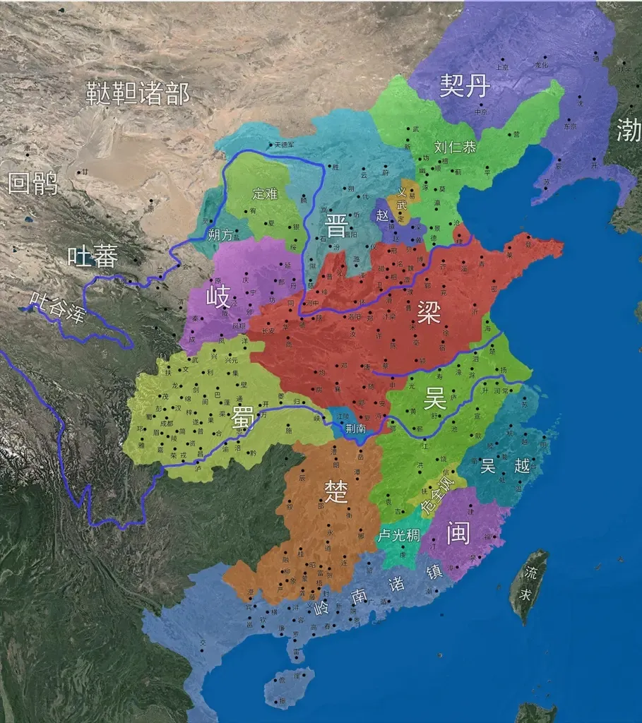 武德充沛的大唐最终亡于藩镇割据,建立五代第一个王朝后梁的朱温是唐末军事实力最强大的节度使。朱温篡唐后,并没有能力重整河山,反而为各地早已游离于中央政权管控之外的藩镇树立了一个很坏的榜样。一时间,中华大地陷入四分五裂、割据攻伐当中,也为整个五代种下杀伐混乱的政治基因。朱温晚年在继承人问题上犹豫不决,最终被儿子朱友珪弑杀篡位,一年后朱温三子朱友贞诛杀朱友珪,成为后梁最后一位皇帝;后唐庄宗李存勖,一代枭雄,平灭后梁却死于伶人之乱,没有指定明确的继承人,义兄李嗣源被众人拥戴即位。李嗣源晚年遭遇次子李丛荣反叛惊惧而死,即位的李从厚更不是太子,很快就被李嗣源养子李从珂率兵推翻;后晋石敬瑭,靠契丹扶持上位,传位给养子石重贵,过程也充满变数;