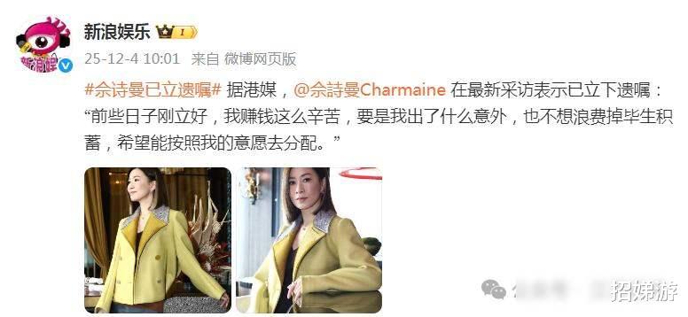 为什么大家现在都关心这件事,因为这几年确实有艺人突然离世,遗产问题闹得很大,普通人也开始考虑,如果自己遇到意外该怎么办,佘诗曼这么做不是害怕死亡,是尊重她多年来的工作成果,内地明星大多回避这个话题,她却公开谈论,可以算是一个少见的例子。