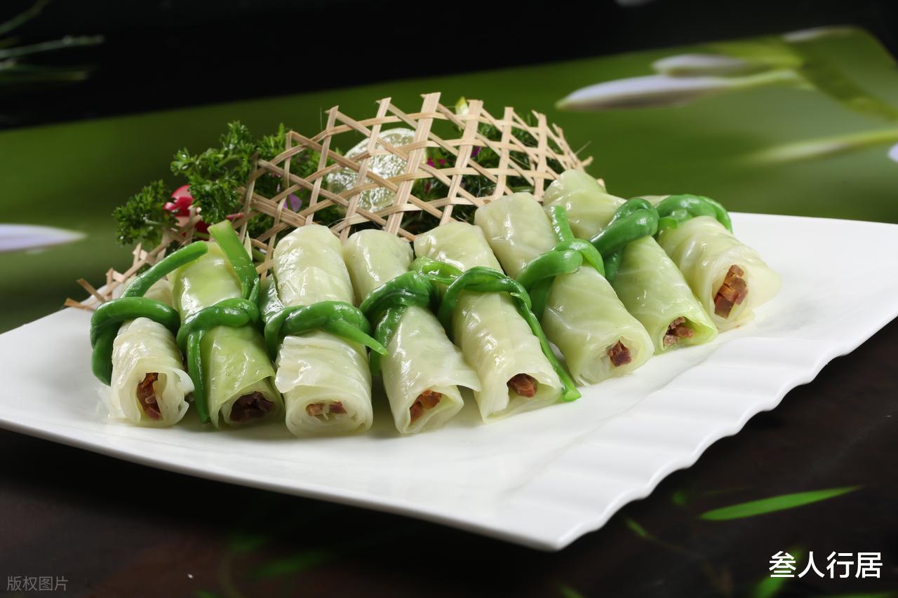 北方的冬日,大白菜是囤在院中的"年货担当"。取最外层墨绿叶片焯水至柔韧,内层嫩黄菜心切丝与胡萝卜、香菇碎同炒,裹成玲珑卷状蒸制。出锅时淋上晶莹的芡汁,宛如翡翠雕成的元宝。