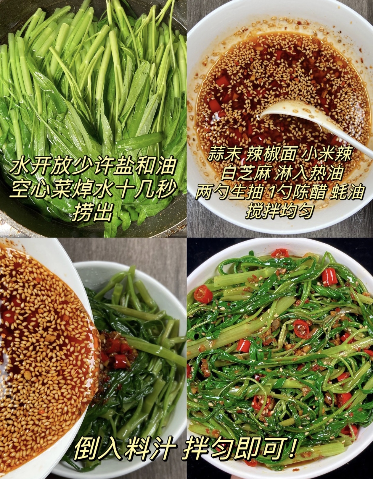最后一步就是把料汁和空心菜拌在一起。把过凉的空心菜沥干水分,放进一个大碗里,然后把调好的料汁倒进去,用筷子翻拌均匀,让每一根空心菜都裹满料汁。这时候你就能闻到浓郁的香味了,酸辣的味道直钻鼻腔,让人忍不住想流口水。拌好之后就可以装盘上桌了,撒上一点小米辣圈和白芝麻点缀一下,颜色红绿相间,看着就特别有食欲。