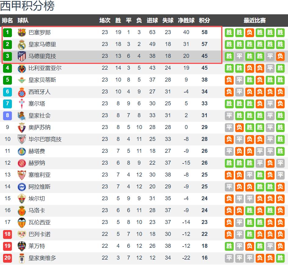 马竞之前曾在西甲第7轮的比赛中主场5-2大胜皇马,真是“暴打”皇萨。不知道的球迷还以为马竞是西甲本赛季的“王”。但一看西甲积分榜,马竞虽然排名第三,但与前二巴萨和皇马的差距那就是巨大的。西甲23轮战罢,巴萨积58分,皇马积57分,而马竞积45分,马竞落后皇萨至少12分的差距,可以说无力争冠,但争四又无忧。