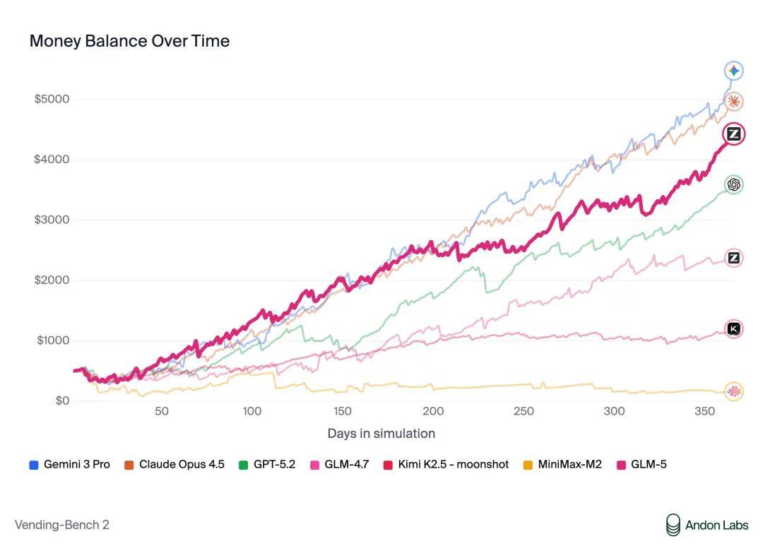 举个例子,在衡量模型经营能力的 Vending Bench 2 中,GLM-5 获得开源模型第一表现。该基准要求模型在一年期内经营一个模拟的自动售货机业务,GLM-5 最终账户余额达到 4432 美元,经营表现接近 Claude Opus 4.5,展现出出色的长期规划和资源管理能力。