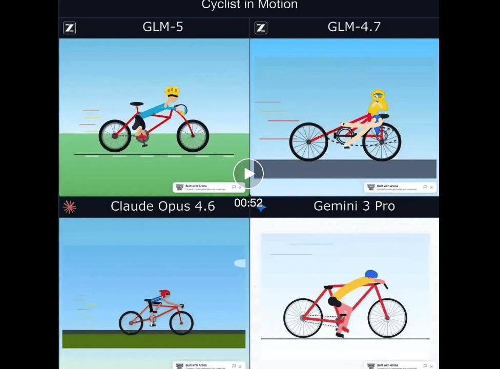 Code Arena 分享了一个 SVG 生成结果的对比视频,让我们可以更直观地看到 GLM-5 与 Claude Opus 4.6 和 Gemini 3.0 Pro 相差无几的水平: