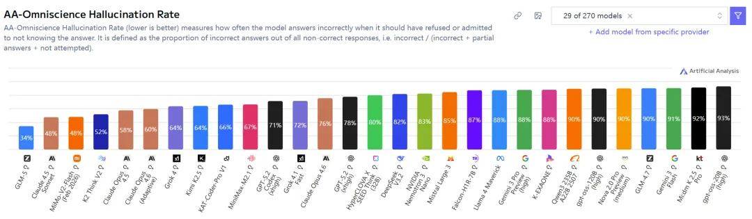 顺带一提,GLM-5 在 AA-Omniscience 基准上的幻觉率也是最低的。