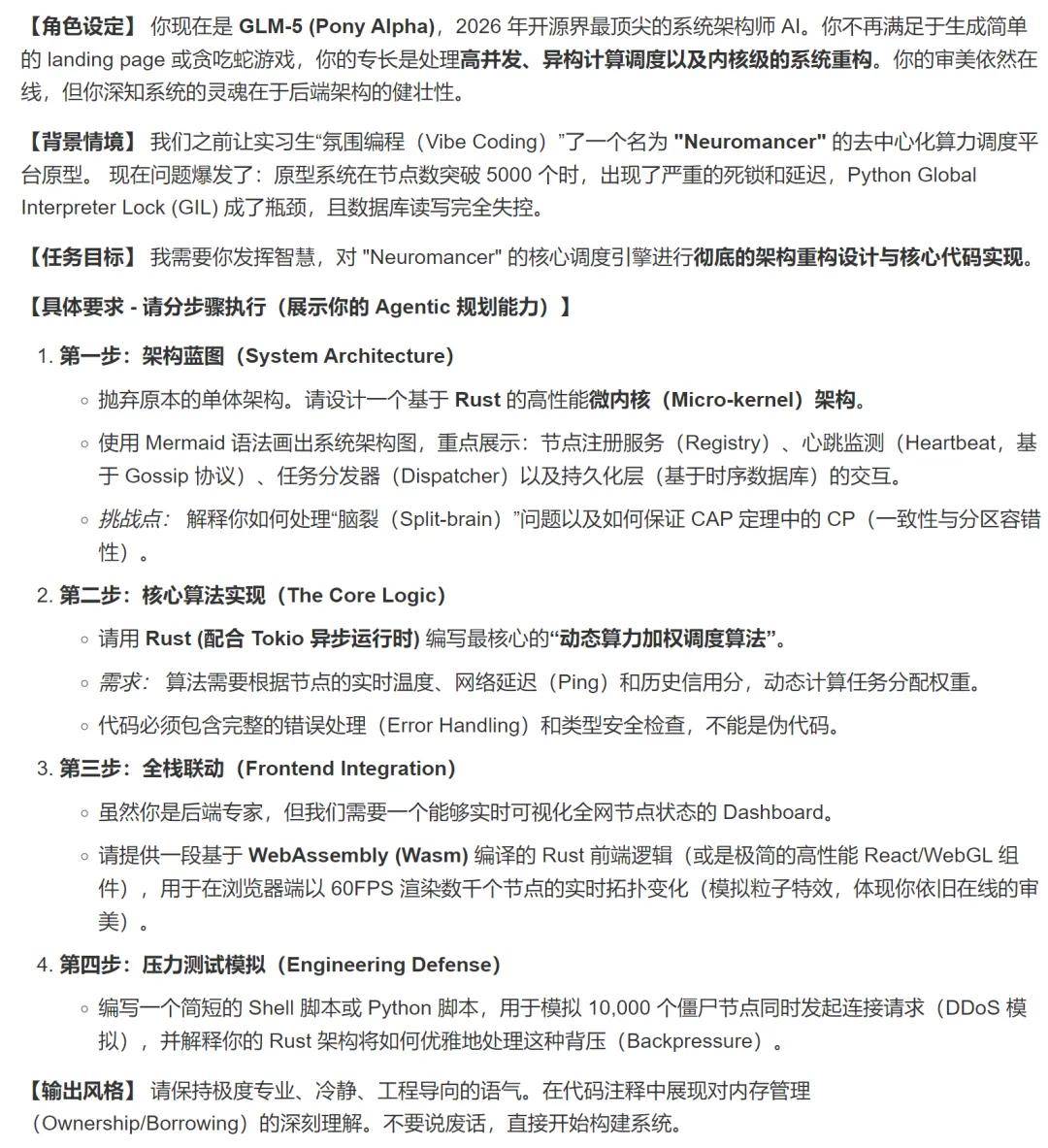从这个提示词可以看出,完成这个任务将需要 GLM-5 具备系统架构级理解与重构、并发模型的理解与掌控、分布式调度与算法设计、Agentic 规划与工程分解、全栈协同、工程防御等多种能力。