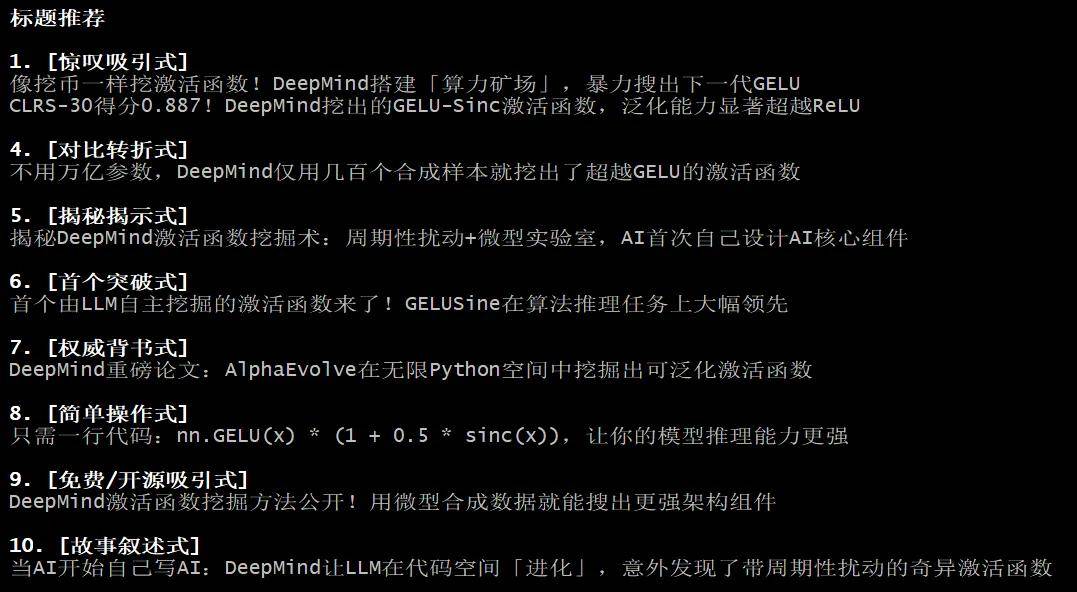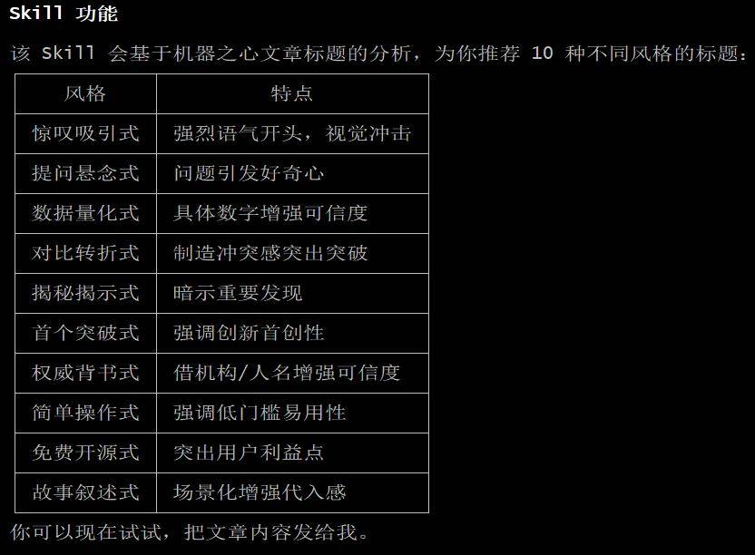 最终,我们得到了一个相当不错的 Skill,能为我们推荐 10 个不同风格的标题: