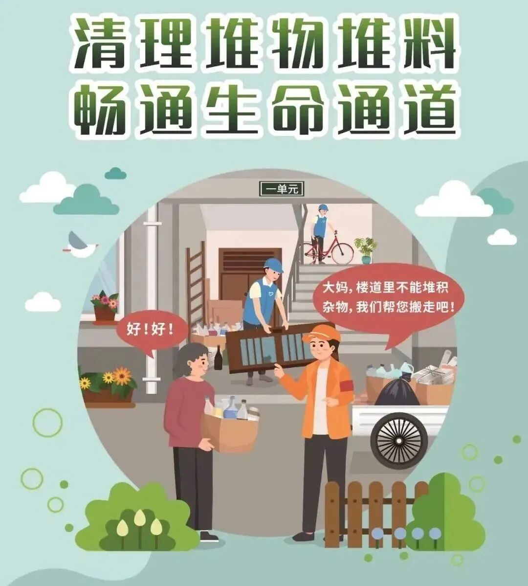 楼道堆放杂物容易造成通道堵塞,发生绊倒摔伤等事故。遇火灾时,严重影响疏散逃生。遇到120急救接诊时,还会影响担架使用。