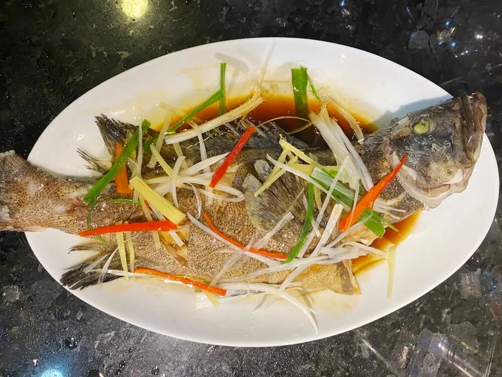 做法也特别简单,把石斑鱼处理干净,在鱼身上划上两刀,放上姜片、葱段,淋少许料酒去掉腥味,上锅蒸8-10分钟,蒸好后淋上一勺蒸鱼豉油,浇上一勺热油,撒上葱丝、红椒丝点缀一下,既好看又好吃,寓意“年年有余、吉祥顺遂”。