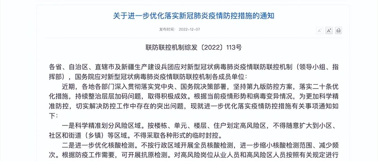 12月7日,国家发布了《关于进一步优化落实新冠肺炎疫情防控措施的通知》,被简称为新十条。相比二十条,新十条在有关健康码、核酸证明、落地检、集中隔离方面有了统一的政策和说明。