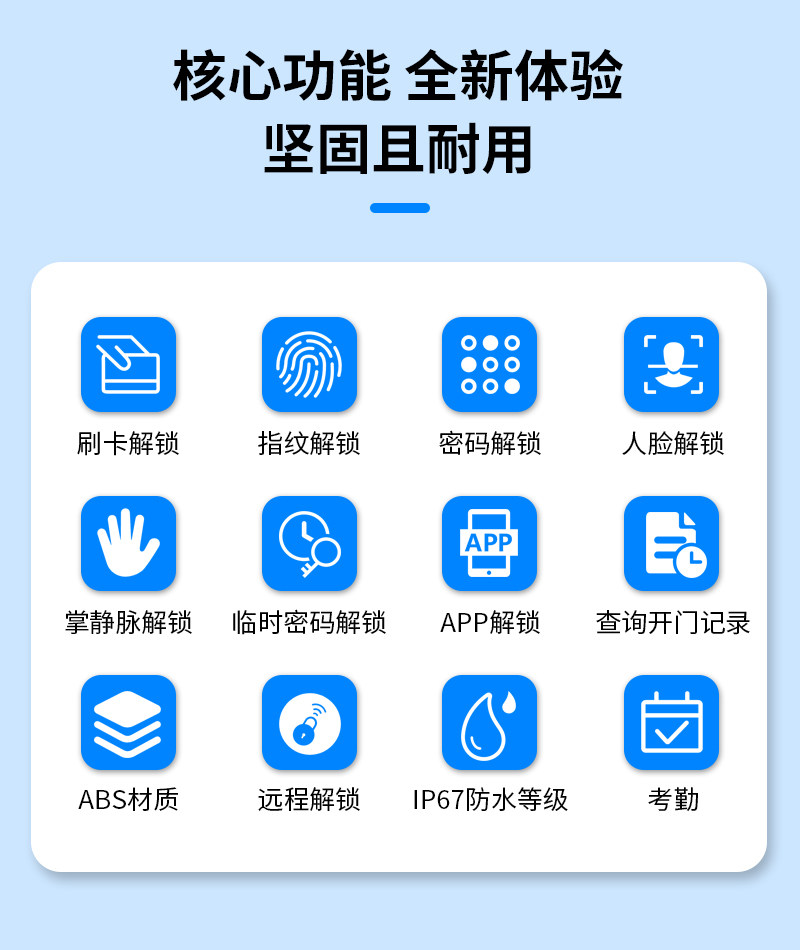 功能完整:保留机械钥匙应急开锁,同时支持远程密码、临时密码、人脸识别,满足消防要求
