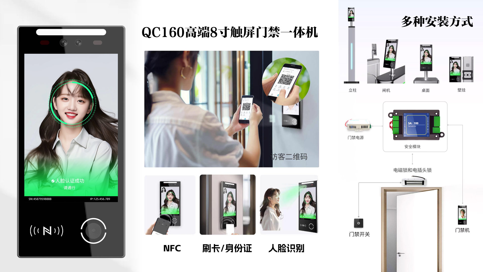 产品形态:以启辰QC150(Linux系统)和QC160(安卓系统)为代表,配备8寸高清触摸屏,集人脸识别、刷卡、密码、二维码等多种验证方式于一体。